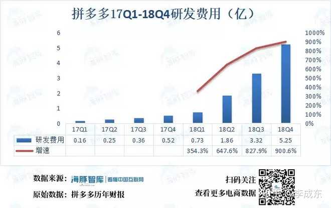 18Q4,拼多多研发费用达到5.3亿元,同比增长900.6%。研发费率从2017年同期的4.5%大幅提高到9.3%。2018全年,拼多多的研发费用上涨764%,达到11.2亿元。
