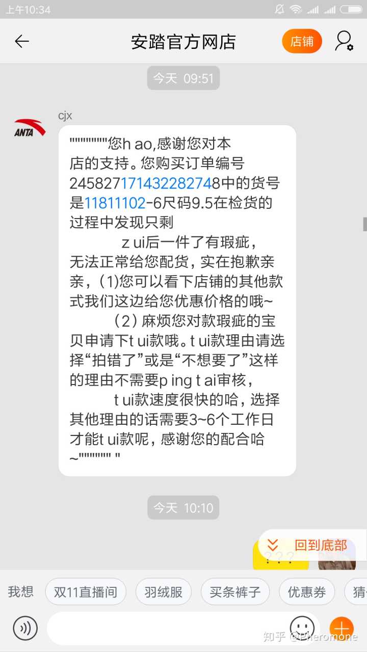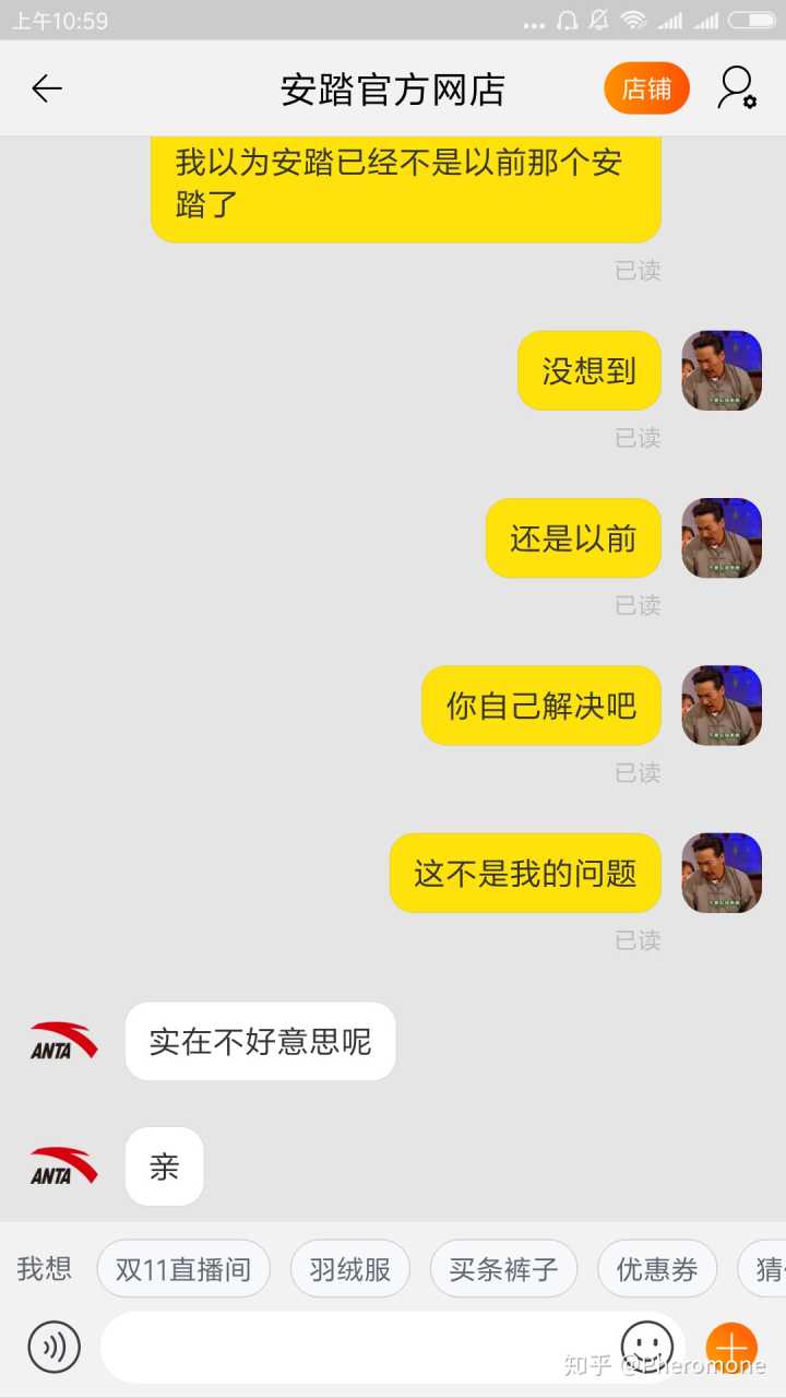 我不知道这是员工自己的个例还是安踏本身集团的问题,还是双十一这个狂欢日产生的病态的问题,我就很有趣成为了其中的牺牲品。我不知道其他人的情况,反正就我而言是想怒又想笑,主要是这样死猪不怕开水烫的精神真的让消费者没办法,诶。