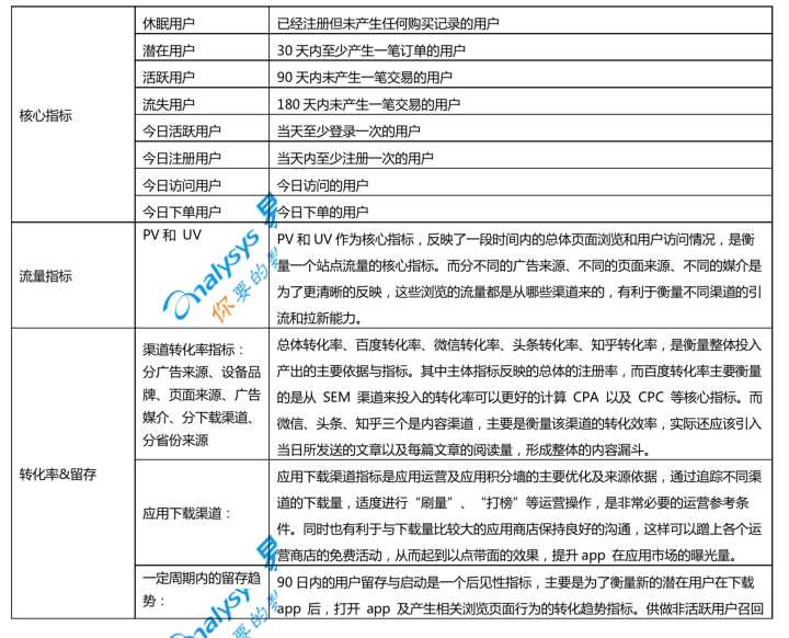 最关键的步骤就是如何制定指标,指标是与业务关联最近的,也是最灵活的一个步骤,因为不同的业务指标完全不同,比如电商业务的指标跟交易有关,软件业务的指标会跟注册有关,虽然都会归结于范交易,但是在指标体系搭建上还是略有不同,我们总结了一些可快速上手的行业通用指标,给你在开始进行网站或APP分析前一些指标体系的建议。