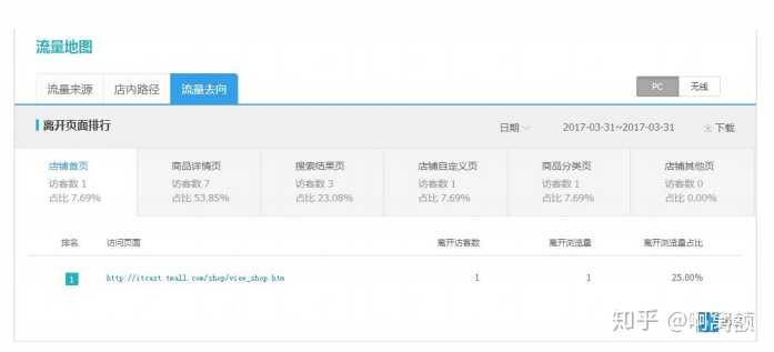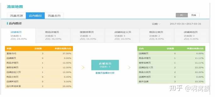 这里数据可以自由选择一天,一周或者是一个月。通过一个数据整体概况知道自己一个店铺的一个情况,从这个数据就可以看出“我的淘宝”和“购物车”的转化率是最高的,自然搜索转化还行