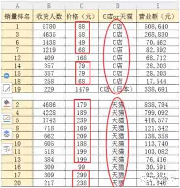 然后根据把这些商品的“收货人数”、“价格”、“c店还是天猫”、营业额统计成表格进行分析,
