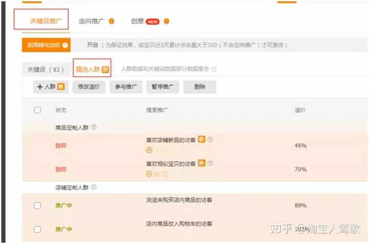 那些优质人群,比如放入购物车的访客,收藏过店铺的访客,浏览未购买的访客,购买过店内商品的访客等,这些是一定要去投放的,这些都是非常精准的。根据实际情况进行溢价设置。