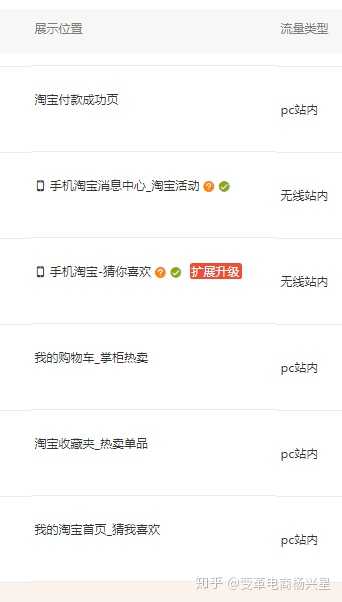 B 展现位置: 常见的在掌柜热卖(我的购物车),猜你喜欢(我的淘宝首页),热卖单品(淘宝收藏夹),物流详情页(我的淘宝),已买到的宝贝(我的淘宝),不过目前PC端的访问量占比较少,主要推广的还是无线端,猜你喜欢(手机淘宝首页),淘宝活动(手机淘宝消息中心),说到定向,首先想到的就是猜你喜欢的位置,这个展现位置是根据买家搜索习惯形成的,把合适的产品展现给用户,这个地方流量比较大,除了付费流量还可以得到比较不错的免费流量