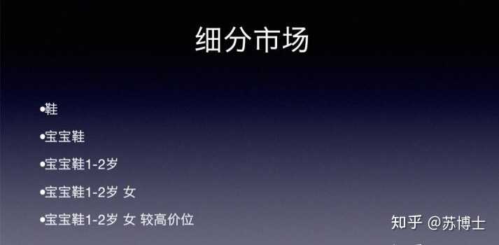如果你去卖鞋,我们知道鞋这个市场非常的大,而做普通女/男鞋的更是大众化了,我们可以选择宝宝鞋,但是宝宝鞋还是很大,就再在宝宝鞋里特定细分,比如说“宝宝鞋1-2岁”,甚至“宝宝鞋1-2 女”等。市场越细分,人群越精准,获得流量才会更加容易,也会相对专业。