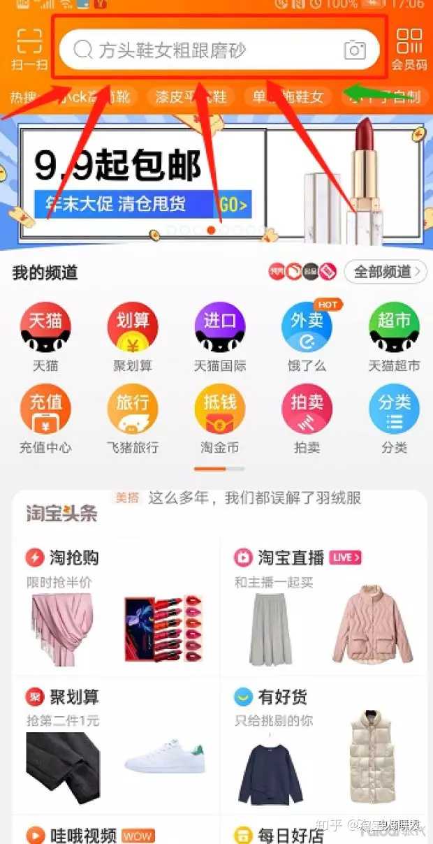 (1)首先,直接在淘宝首页搜索关键词。这里注意,淘宝首页搜索框搜,而不是淘金币搜索框,注意区别点。