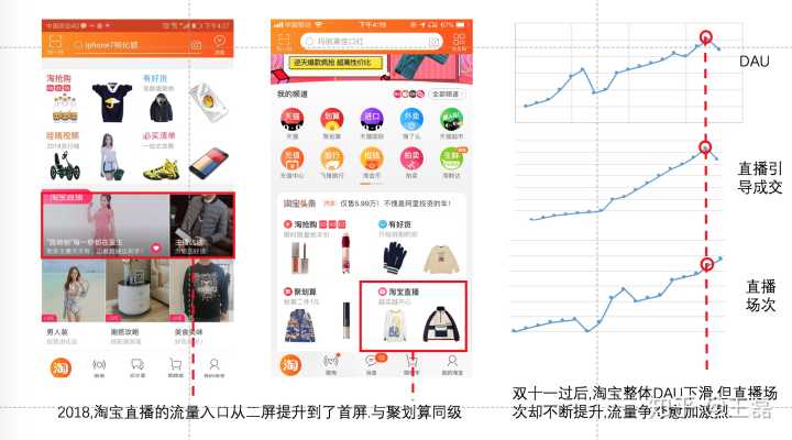 2018年起,淘宝直播的流量入口从2.5屏上升到了1屏,淘宝是一个拥有十亿终端的平台,一个微小的窗口变动都能让流量暴增,流量就意味着:无数活生生的潜在购买用户,从淘宝终端转到了淘宝直播.