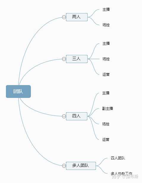 一个人能获得成功的那是为数不多的天才,大多数人的成功都是建立在一个team上。主播间的团队通常的存在模式有两人、三人、四人还有多人。两个人的团队主要是主播和场控,主播的工作量会很大,场控有时候还会以副主播的形式出现;三个人的团队主要是主播、场控和运营;四个人的团队主要是主播、副主播、场控和运营,四个人的团队已经算是一个很完整的团队了;多人团队就是一个四人团队+多人协助工作,这样的大团队合作起来效率高但也需要磨合。团队在人数方面是没有太多要求的,只要大家配合默契、提高效率为一个目标努力就是一个合格的团队。