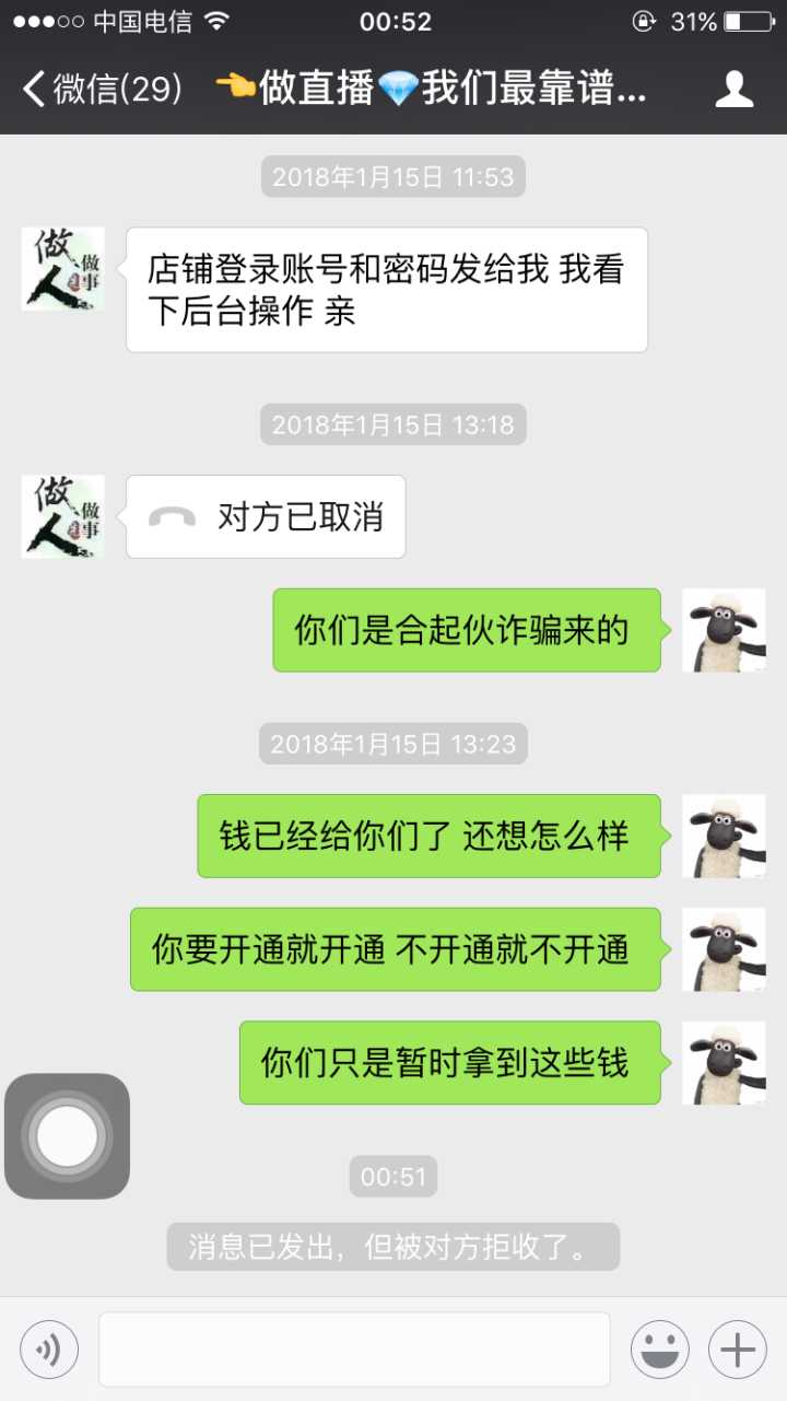 我被淘宝直播代办骗了。几千块钱也是钱,小李直播,现在改名了,让打款到伟程商贸二店,钱给了各种理由开通不了!警醒大家!我花了4200,什么也没办!讲述我的经历,8月份百度搜到小李直播代办,淘宝直播,一直怕是骗子没有交钱!到九月底,我实在想开通,又找到他们,之前说1600加淘宝粉丝一万包开通,交钱以后又要收2600,跟那人大吵一架,但他说包给你开通,我是真心服我自己了,就这我也相信了!等录完视频了,说颜值底,可以以卖家开通,再加两万粉丝,3200,我没再给他!