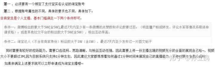 条件一:微博粉丝数要大于5W(含5W),最近7天内至少有一条微博的点赞数和评论数要过百;(明显僵尸粉或转发、评论水军等情况将取消申请资格);或者其他社交平台的粉丝数大于5W(含5W),粉丝互动率高。条件二:淘宝达人(不含有商家身份)粉丝数大于1W(含1W),最近7天内至少发布过一片图文帖子 同时需要有较好的控场能力,需要口齿流利、思路清晰,与粉丝互动性强,因此需要上传一份主播出境的视频充分的全面的展现自己哈~,视频大小不要超过3M,因为目前系统只支持1分钟左右,因此建议大家都想想看如何通过1分钟时间来展现自己的直播能力,不要仅限于自我介绍哈!