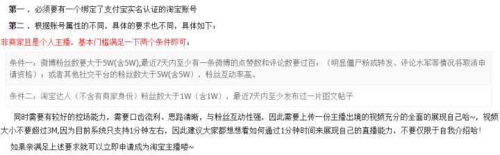 条件二:淘宝达人(不含有商家身份)粉丝数大于1W(含1W),最近7天内至少发布过一片图文帖子同时需要有较好丝互动率高。需要有较好的控场能力,需要口齿流利、思路清晰,与粉丝互动性强,因此需要上传一份主播出境的视频充分的全面的展现自己,建议大家都想想看如何通过3分钟时间来展现自己的直播能力,不要仅限于自我介绍!