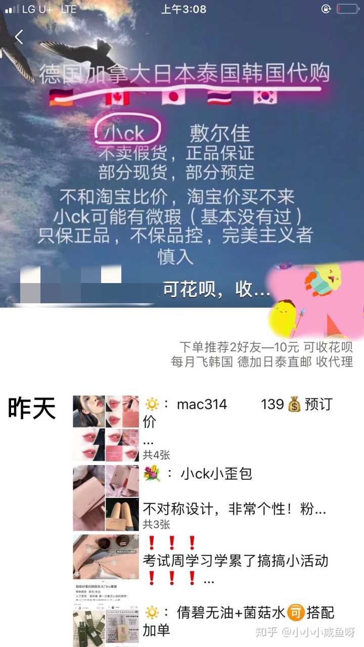 加了微信发现,小姑娘开始卖东西了,在我加她以后,她最开始卖枣夹核桃,然后卖ugg,然后开始做代购,经常飞日本韩国。人家的朋友圈极其大,并且有一个500人大群,多少次没有下单买东西的人就请出去,然后拉新人进来。人多是非也多,经常看到她往群里发一些跟别的顾客吵起来的聊天记录,并且群里也有一堆人帮她说话。让我惊讶的是,当初她要打的我的室友,竟跟她关系如此近,并且经常在群里帮代购讲话。