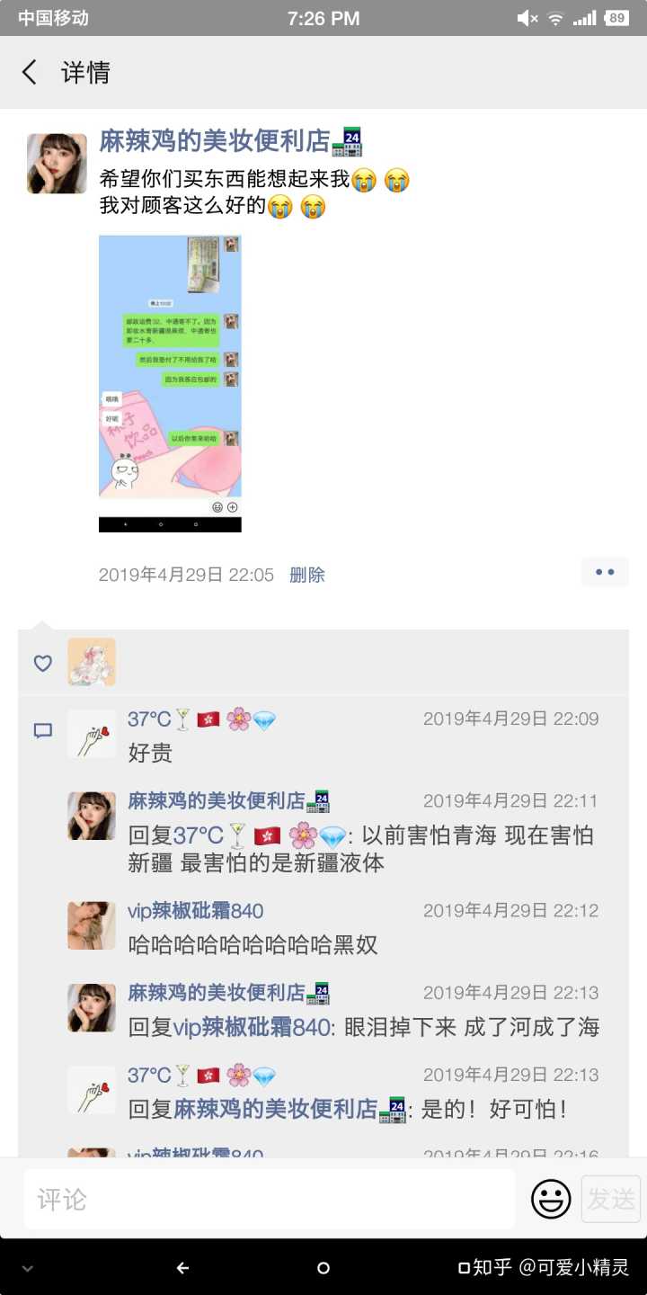 还想骗我入代理!!!!我是绝对不会祸害我身边的同学的,其实买东西就是图一个信任,消费者的信任最为坚固,也最为脆弱,我之前买了一个国货的口红(明明说好不买风很大的,结果营销风太大,直接吹跑我,对不住了姐妹们,我就买了,结果…嗯,还是存钱买心里的白月光吧),然后不管它家营销得有多成功,李佳琦再怎么推荐,一律不会买,因为踩雷太痛苦了。而我之前盲买的一款乳液,ri!!!!!完美!!!将我的大油田调理成了混油!!然后对它家的全线产品莫名好感!…啊扯远了,我就是想说,她配不上我的信任。