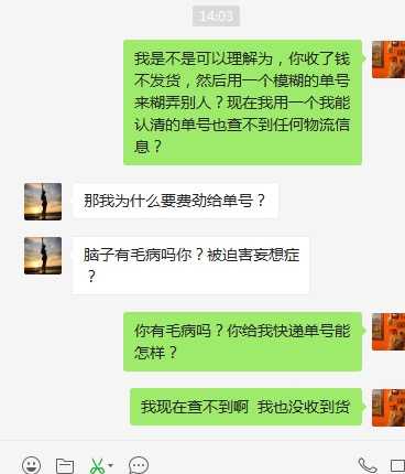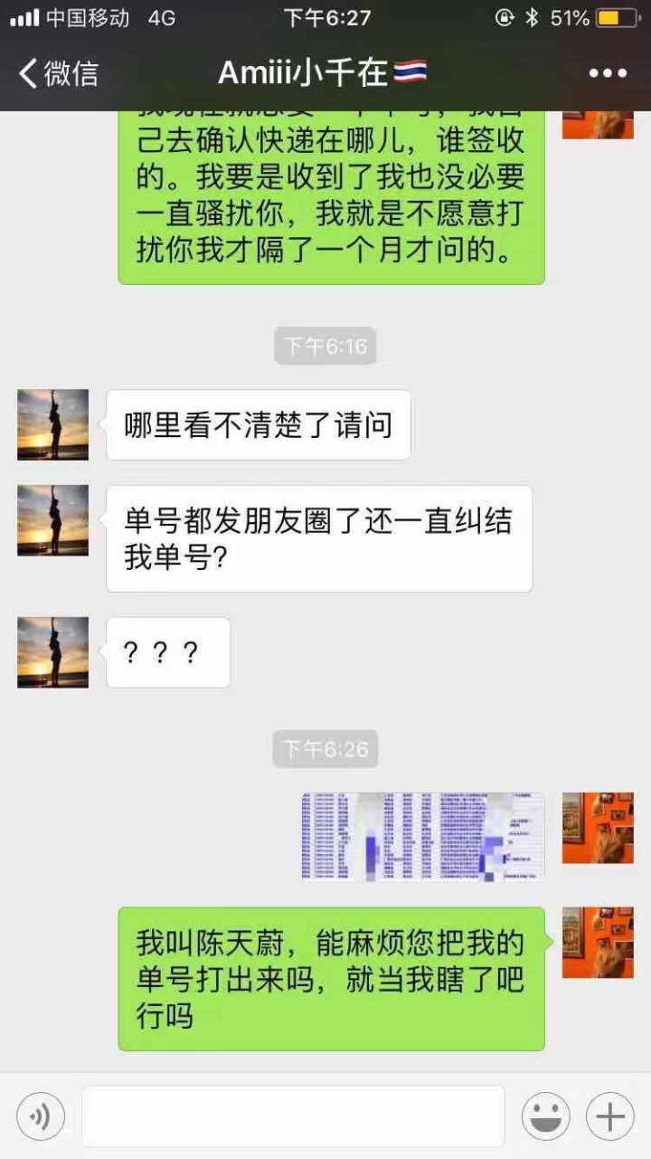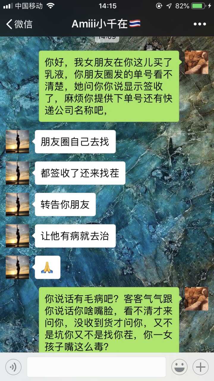 挂一个人吧,女票在她这儿买了乳液,一百多块钱,问啥时候到货,因为她的朋友圈发的快递号截图根本看不清楚,她回答是已签收,(女票没有收到货)并且态度非常恶劣,爱答不理,说话难听,东西没收到又显示签收了估计也丢了吧,单号又看不清楚人家也不提供清晰的图片,说话还这个叼样,真是年纪小脾气大,