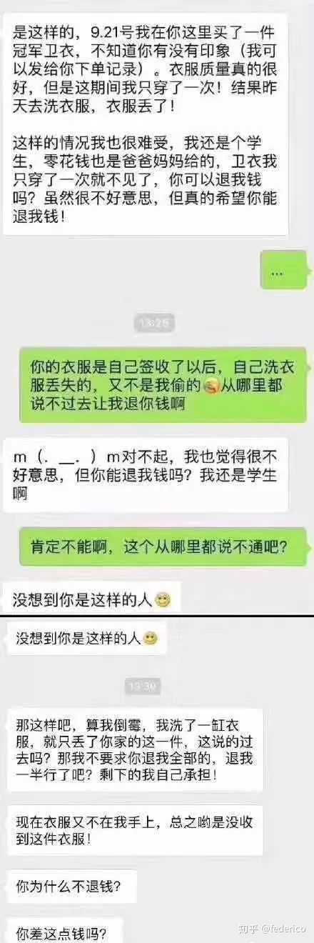 其实,我对那种问价不买的也还好,日常比价,或者确实价格超过了她的购买力,或者就是好奇了解一下,这在日常生活里都正常。我一般回答了价格没有下文的话就没有,这个没啥。但有一种客户,我遇到过一次,行为就完全是人品不正了,直接点说就是想讹你的钱。