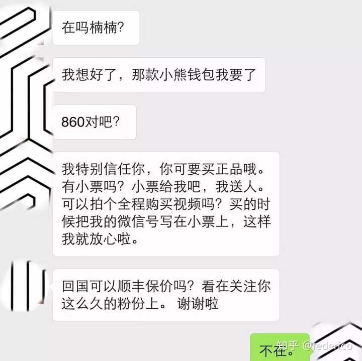 问了价格不回复直接跑的,这应该是大多数代购都遇到过最常见的类型吧。喝着黄浦江的水,打着大西洋的浪;买lv的口气,讲小ck的价。价格不合适非常正常,香港的很多东西专柜是没有价格优势的。但是我觉得,又不是问了就要你买,花了时间心力帮你查了价格,最最起码是不是应该答复一声要还是不要?即使当即没有下定决心,说声考虑一下,然后谢谢会怎样?