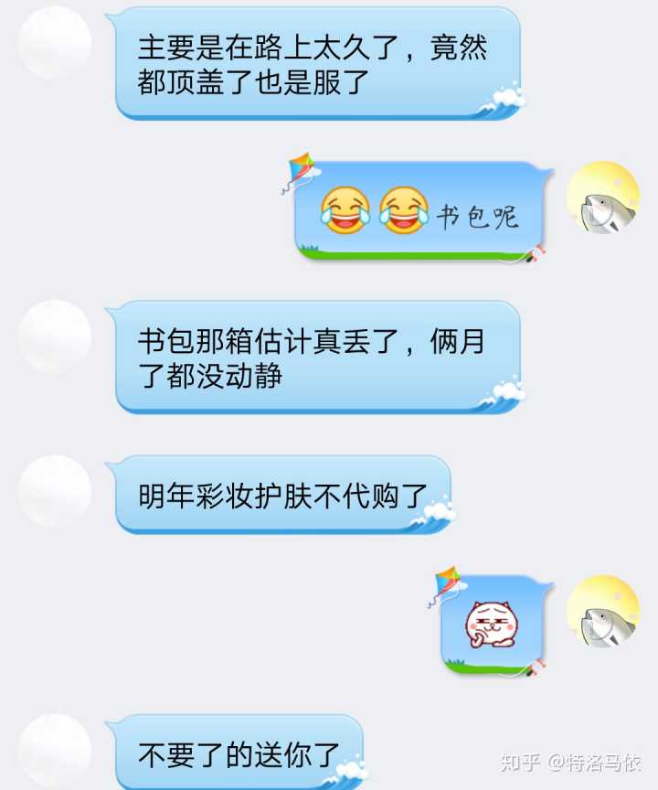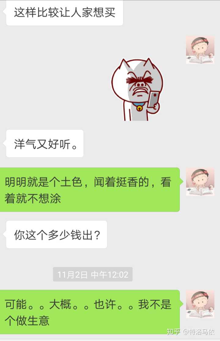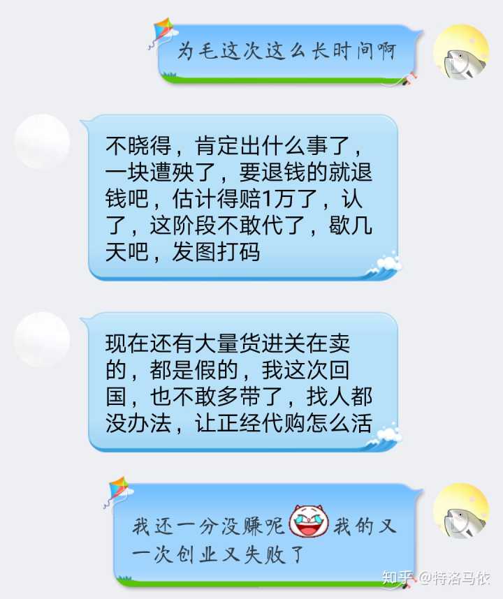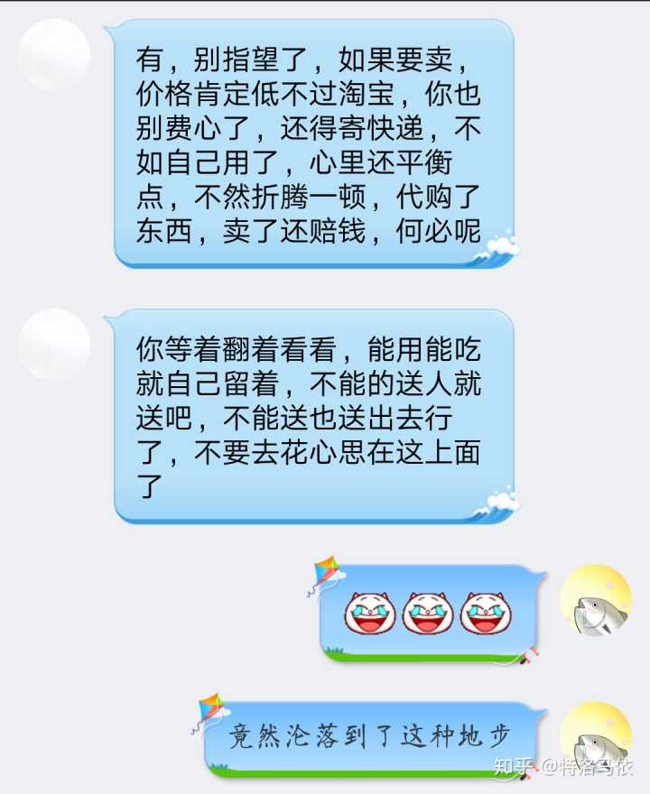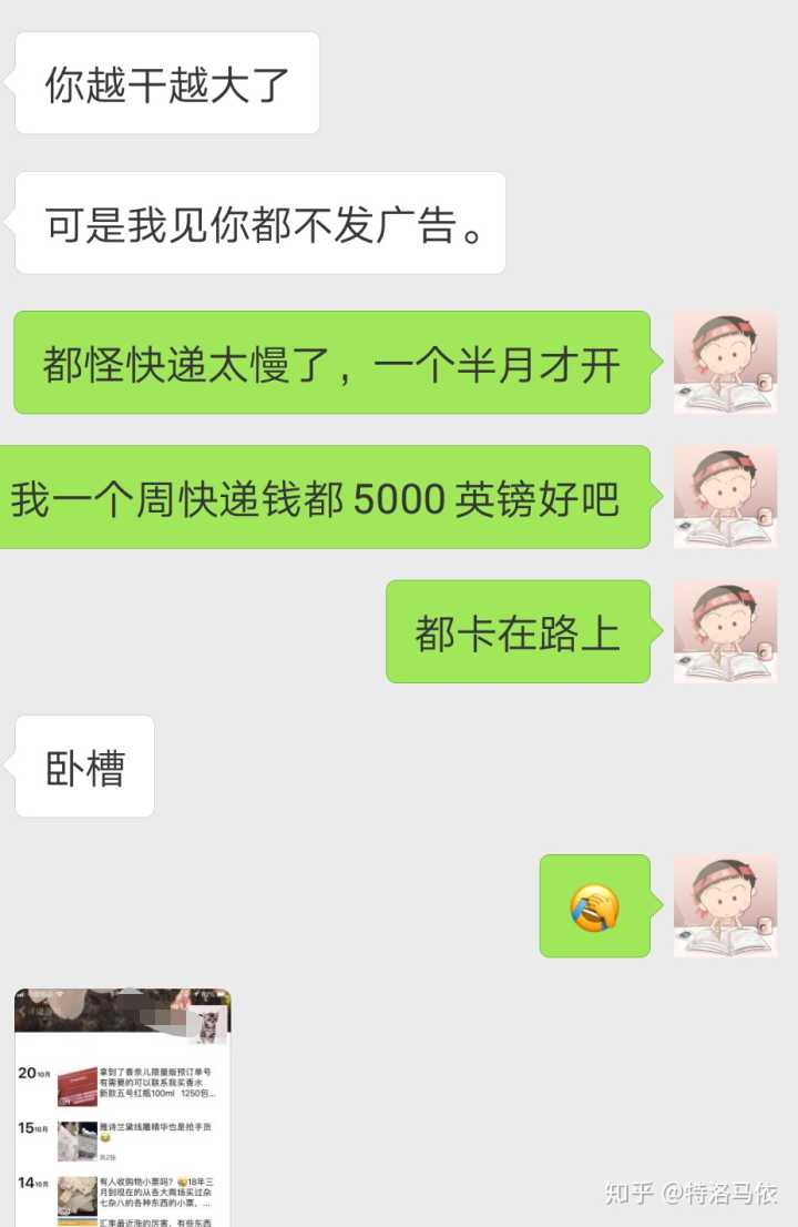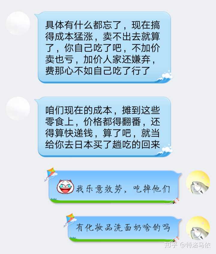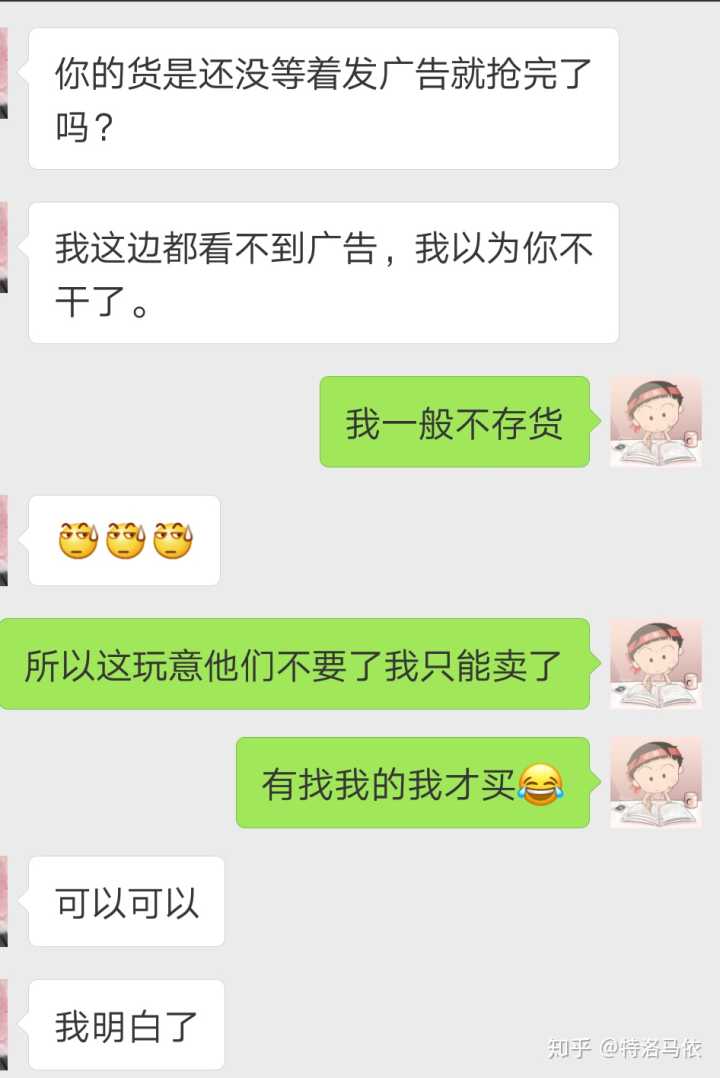 附上一些佛系的我的卖东西日常。。。分为和顾客卖东西日常,和老板沟通日常,还有朋友圈日常。。。对了,说起这个,我微信两个号,一个正常生活号,一个卖货的小号,这就出了一个问题,有的人要找我买东西都得靠缘分,有时候我一天都不上小号,因为我不囤东西,如果没人买了又退了,我是没压货的,但是我建议你还是不要弄两个号了,麻烦。。。