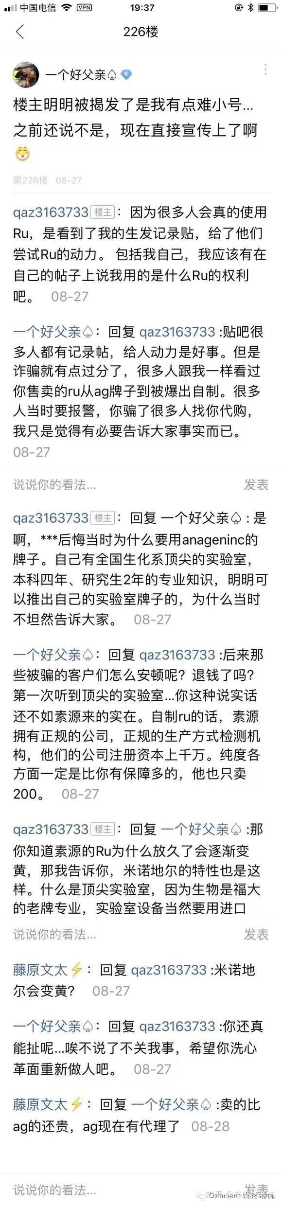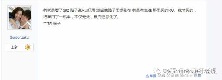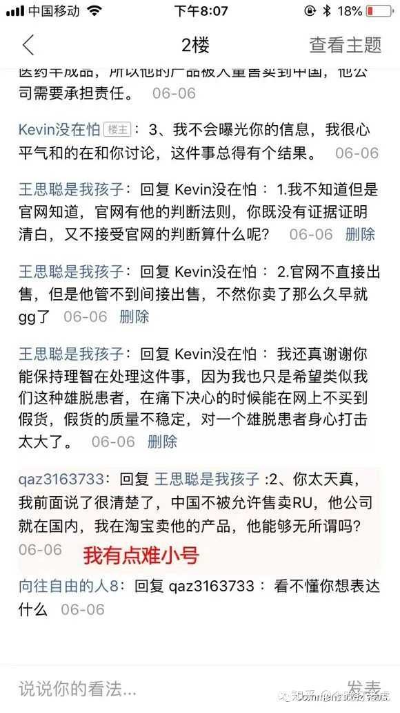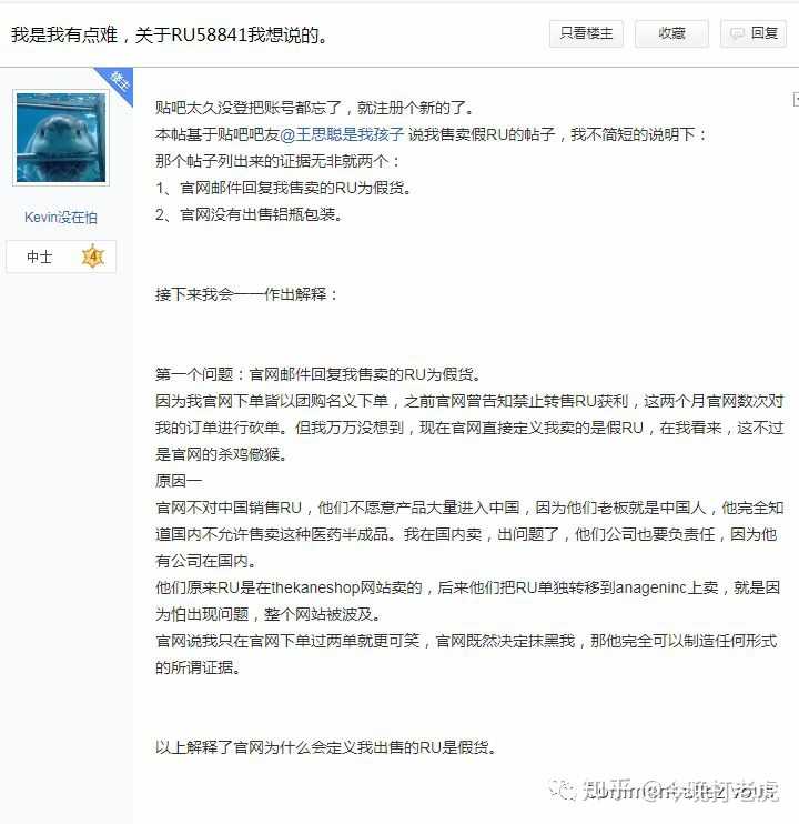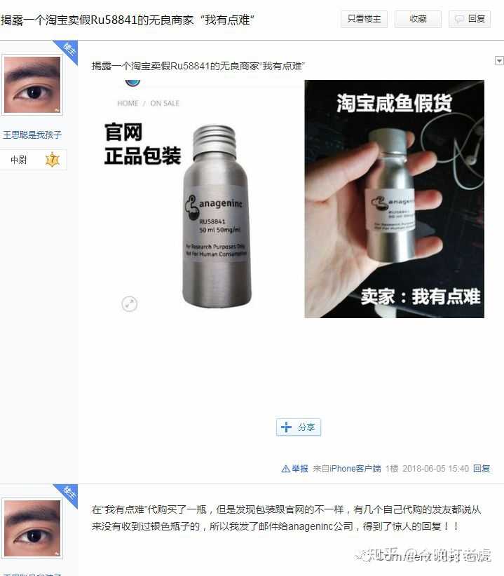 更让人意想不到的是,最近他也在贴吧活跃,突然来了一句不再推荐让人用RU58841。之前他销售的时候就疯狂推销,现在做不下去了就不想让任何人用。我猜测也是因为6月份的时候我的知乎答案很火,其中涉及到了曝光他假货的事情,估计很恨我吧!他估计不希望RU再在中国有人用了,最近也多方面对我举报删帖,把关于RU的正面记录帖子和我的知乎答案删除(他也做到了),希望报复一下能给我制造麻烦?