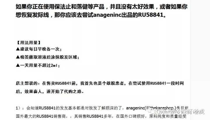 找到一张他之前店铺的RU58841宝贝详情图,对比现在的真是讽刺,就因为得不到他的利益,一个专门分析出RU58841对人体不会有多大副作用的人竟然又改口吹到危害生殖系统去了,张口就来比专家还专家啊,牛逼!(上图为打假前的,下图是现在的)