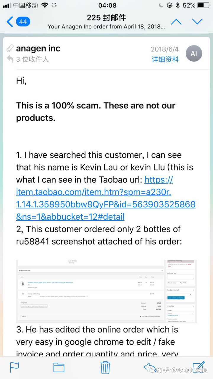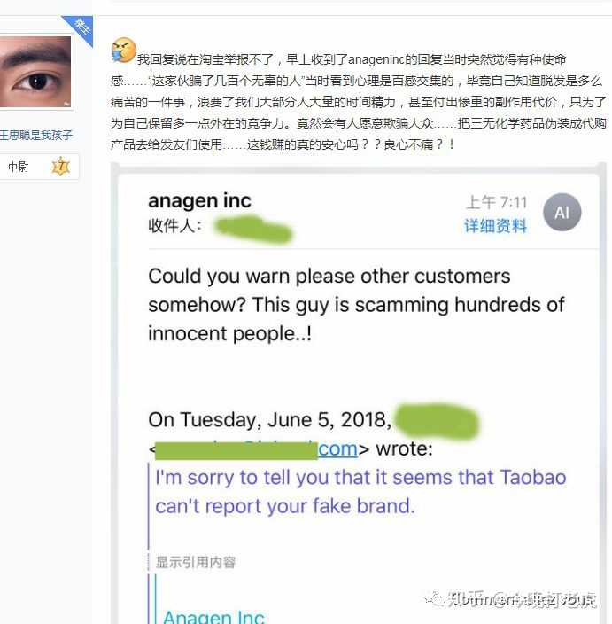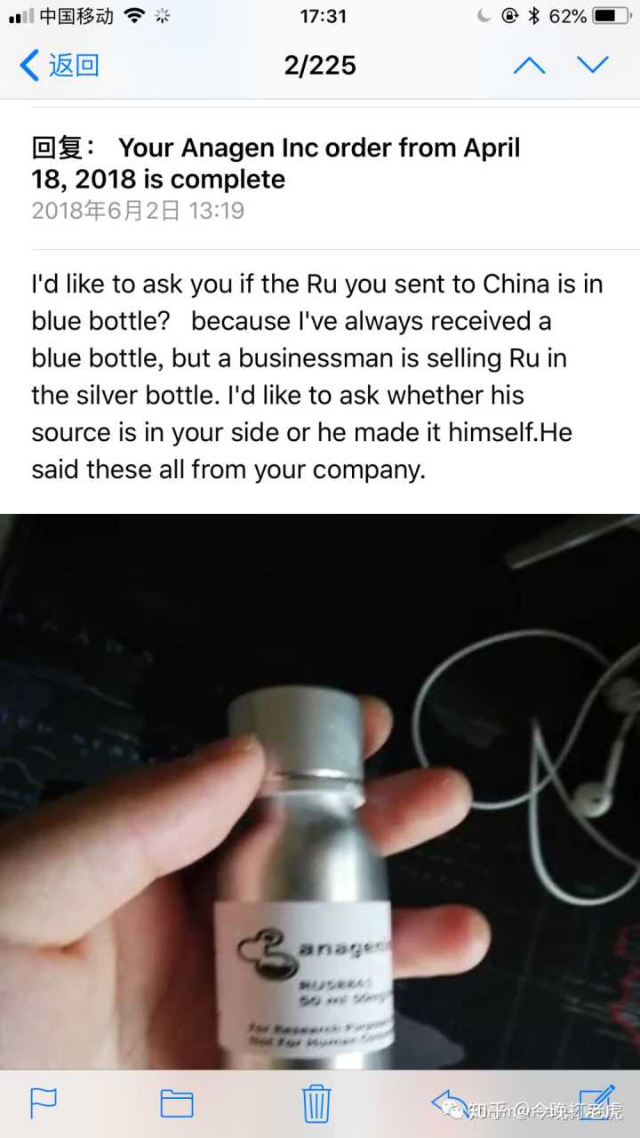 我代购的是一款脂溢性脱发的研究化合物产品RU58841,这产品因为效果极为出众在国外较有名。但因为其产品性质只属于研究化合物,特别是在境内这种被植发机构垄断的环境下,在国内是不能做什么宣传的。在国内只能是小众产品,也让一些人开始动了歪心思。在我用了这个东西受益的同时,国内就有一些闲鱼淘宝商家在销售,其中有一家店主叫“我有点难”的在代购Anageninc的产品。但是我发现外包装跟我自己海淘的不一样之后,便直接与官网求实得到验证是假货。下面是比较具体的事件描述。