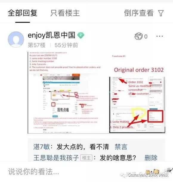 我与官网反应的过程中,官网的人直接注册了一个贴吧账号enjoy凯恩中国,并贴出“我有点难”伪造视频和订单的证据。(但官网的贴吧账号很快被人恶意操作屏蔽)