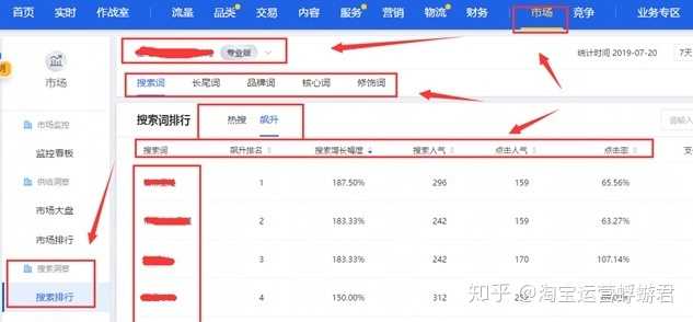 还要一种方法就是直通车利用生意参谋来寻找适合的关键词,在生意参谋的市场下面有一个搜索洞察,在搜索洞察下面有一个搜索排行,点击这个搜索排行选择我们需要观察的细分类目,就会出现关键词的各种数据,其中有一项叫做飙升,直接选择这一项然后寻找我们适合的关键词,把这些关键词记录下来之后也需要观察一段时间,看上升趋势是否稳定,如果稳定就可以直接使用了。