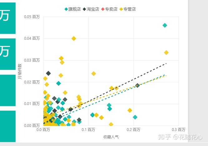 中间这条趋势线是一个分水岭,在上面的颜色块说明斜率比较高,很明显,斜率最高的就是黄色块,专营店。也就是很有可能,在红酒这个类目下,在无线端综合排序下,收藏人气对其销量的影响更大,这个就是所谓的关系分析法。