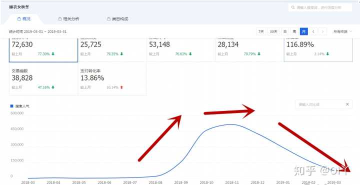 如图所示,现在正是睡衣夏款这一产品需求量的上升期,这个时候选择做,虽说切入的稍微晚了那么一点,但一切还来得及。等到八九月份就是睡衣夏款这一产品的衰退期,这时我们就得提前找好下一个市场切入点的产品,比如睡衣秋冬款,如下图所示。