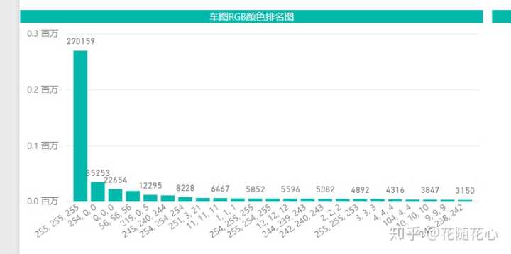 这个图表里头所包含的数据,来自搜索关键词之后,批量下载车图,然后把所有车图里头出现的RGB颜色,都一一记录下来,并提取每一张图的排名前50位RGB的数据。为什么要排名前50名呢?
