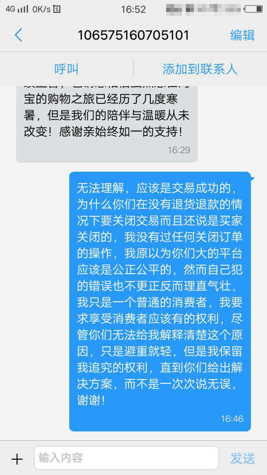 最无语的是淘宝我申请了退货以后卖家拒签收(说我少了一个什么东西)我申请淘宝客服介入维权失败了,商品退回,这个我是完全可以理解的,你说影响二次销售吧给我退回来是合理的,但是你关闭退款正常,为什么要关闭我的订单,好像我从来都没有购买过这个商品,更无语的是我联系淘宝小蜜居然还跟我说退款成功交易关闭,然而我压根也没有退款记录,小蜜推给专家,专家推给高级专家,再给我打电话一直重复七天无理由退换已经超过,闭口不提订单关闭的事,根本就是小二操作失误,商品退回还没收到,现在我也不能再次申请售后也不能进行确认收货和评价,属于堵住了我的嘴还当做我没买过这个商品的样子,原以为这种大平台好歹也是公平公正的,确是连承认自己操作失误的勇气都没有,问题没给解决,解释也语焉,你是大平台我是小消费者,要跟你说辩黑是肯定没有用