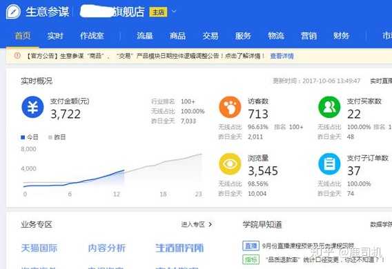 生意参谋可以看店铺流量来源、实时流量、访客数、市场行情、行业大盘、数据分析等等