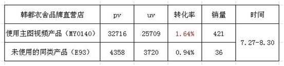 3. 以下为淘宝在2013年8月期间测试50家店铺的其中一家店铺的主图视频数据。 从图片可以看出PV、UV的变化和主图视频关系不大,但是转化率及销量的提升体现了部分主图视频的效果。