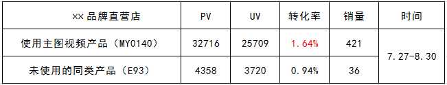 测试50家店铺的其中一家店铺的主图视频数据。 从图片可以看出PV、UV的变化和主图视频关系不大,但是转化率及销量的提升体现了部分主图视频的效果。