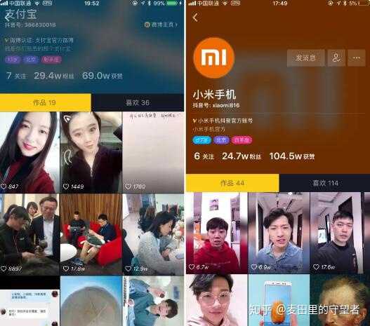 按现阶段可以与支付宝 PK 的,就是小米手机,他是应用了同样手法,将小米运营部的日常结合小米手机主打亮点,拍成抖音段子,并加持时间流广告为账号引流,网易系也应用了类似的手法,看完想去这些部门上班,是个很好的招聘广告。