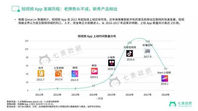 短短4 年后,快手就成为了中国第一大短视频应用。并且这一年,短视频应用开始走向井喷期,产品数量翻倍增长。2016、2017 年共达 235 款。