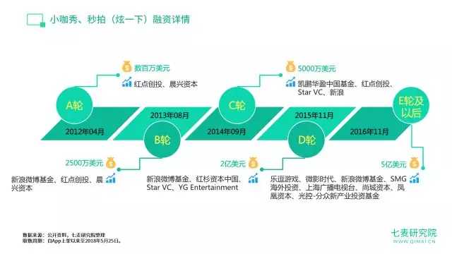 而同属于炫一下科技旗下的“小咖秀”、“秒拍”也一直作为新浪微博的官方短视频产品,2016 年融资已达 E 轮以后,融资金额高达 5 亿美元。