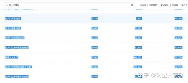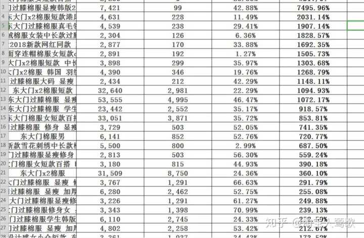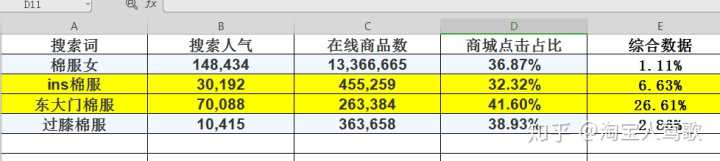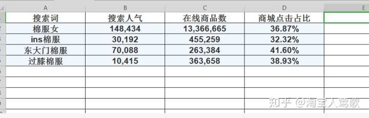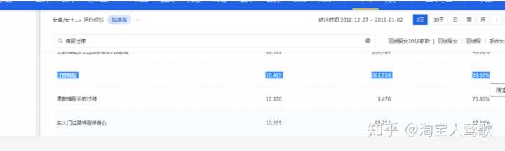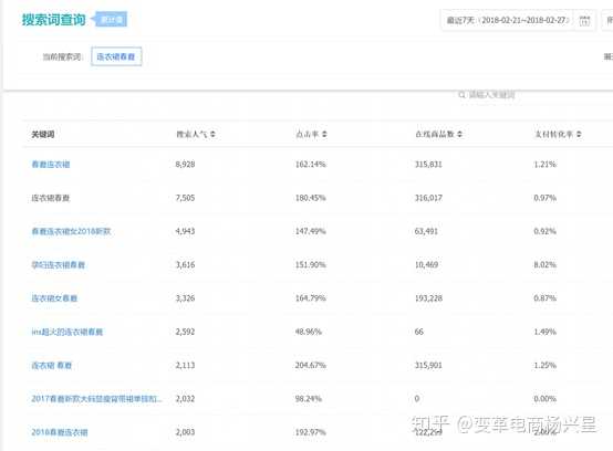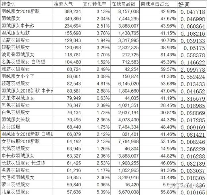 上图就是生意参谋的查词工具,我以羽绒服女这个词来说明,我们只需要看7天的数据即可。搜索出来你会看到很多的长尾词,然后我们先把这些长尾词尽可能全部展开,然后复制到一张表格里,这样才好分析数据,看数据指标的时候只需要看:搜索人气、支付转化率、商城点击占比、在线商品数就可以了