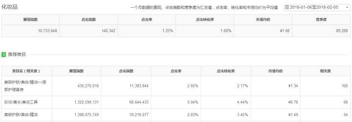 这样我只能拿彩妆/香水/美妆工具类目的直通车数据给你参考一下: