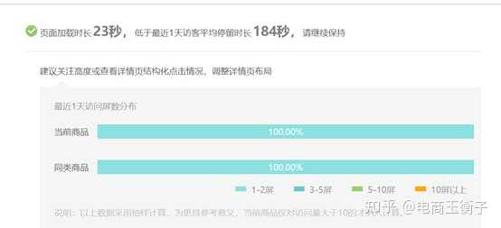 要是自身店铺的停留时间低于行业均值,那么证明无线端页面打开速度过慢,或者是页面前5屏描述不够到位 不能吸引到消费者的兴趣点,无线页面打开速度查看方式在‘单品分析-商品温度计’中,主推款的无线端平均停留时间和店铺基本持平或高于店铺平均停留时间。所以在无线端页面上前5屏基本上承担了单品转化率中80%的展现责任,在优化无线端单品的时候我们除了重视五张主图,还需要重视无线端前五张的展现内容 是否符合目标用户的浏览需求。