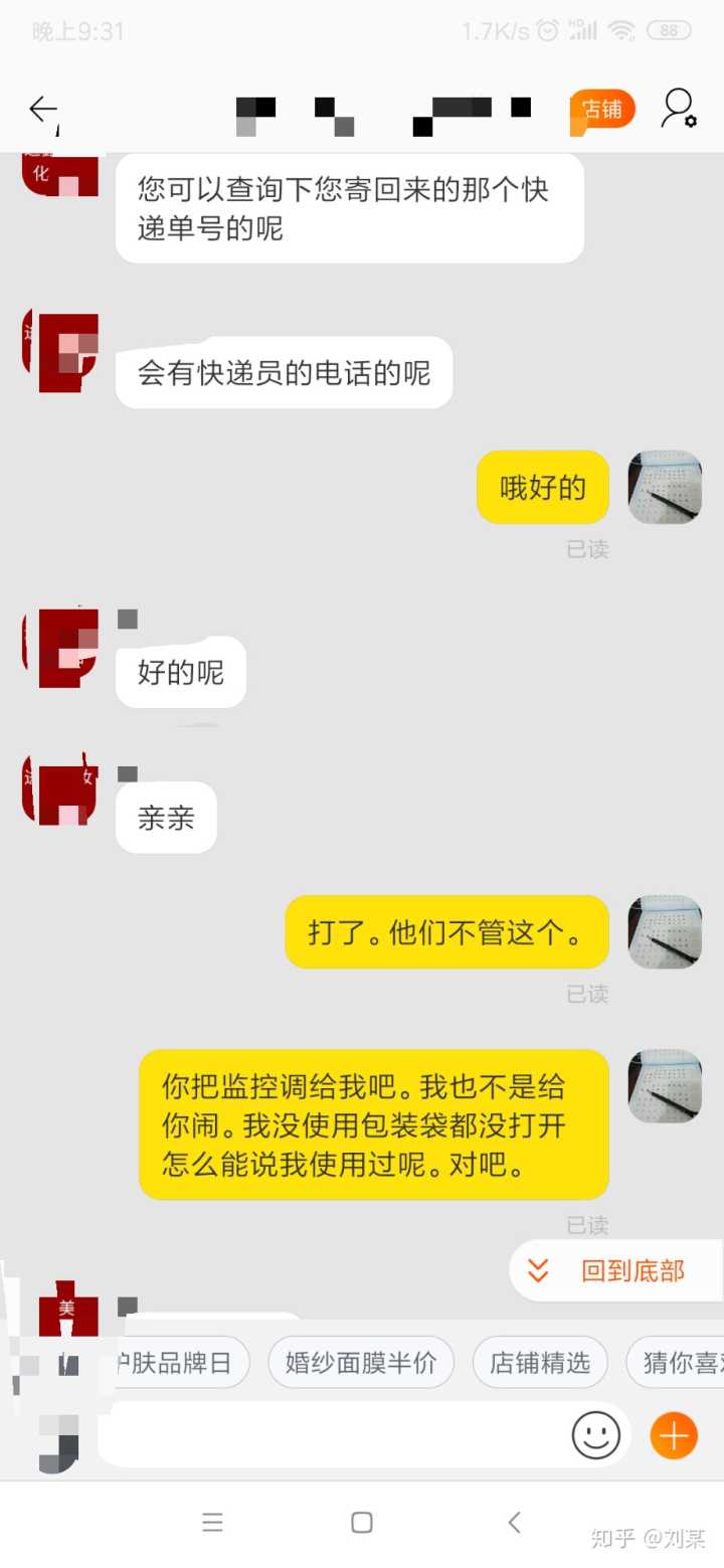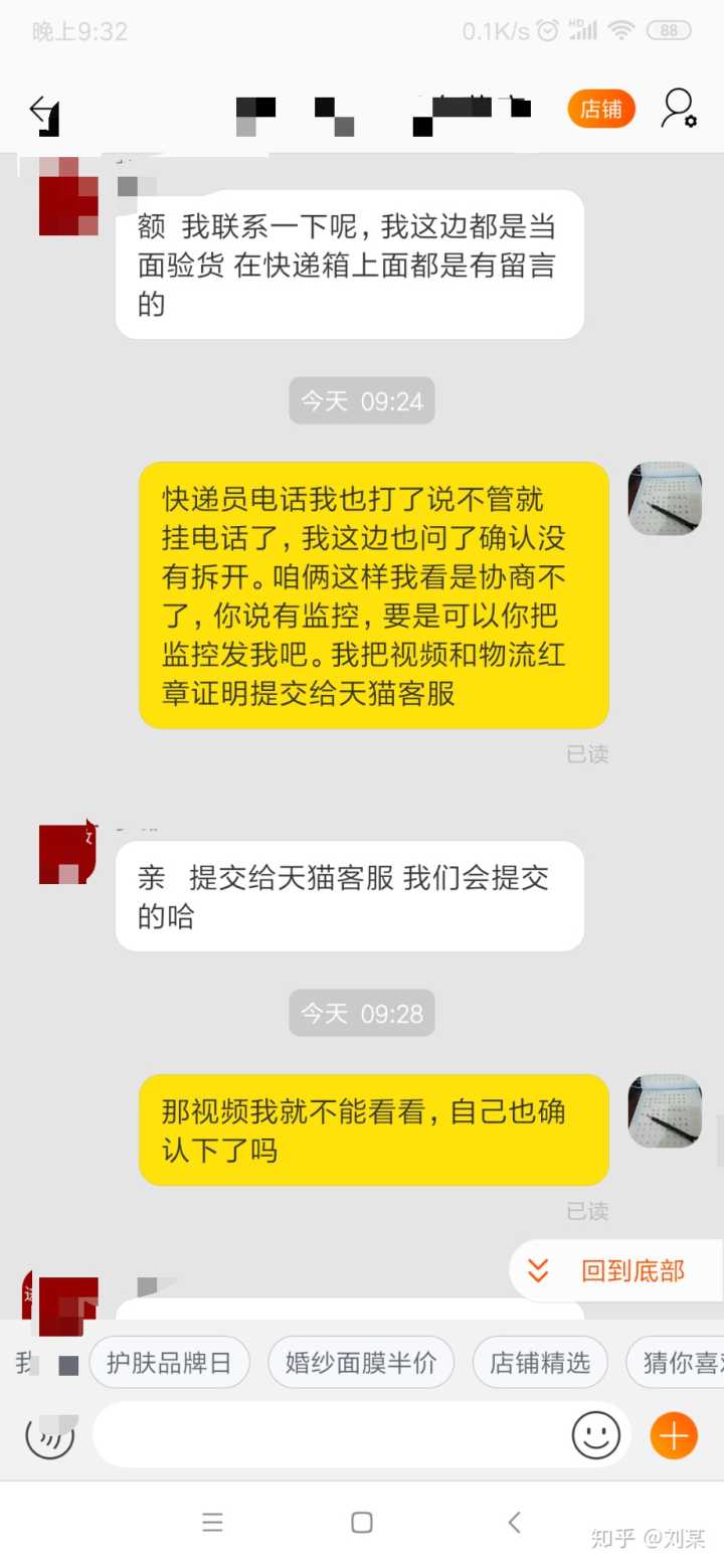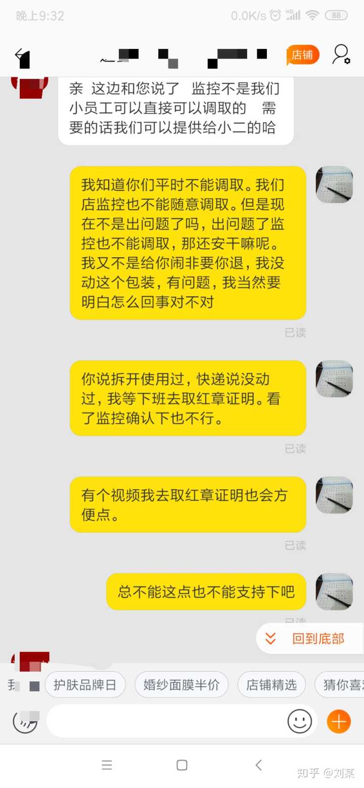 我联系过天猫客服,给我的回复是需要取得快递红章证明才能进行天猫客服维权(这是个牛逼的东西,牛逼到你去试试就知道多牛逼了)如愿以偿我去寄快递的地方(小县城只能自己去寄快递)里面的人说他没有这个红章,需要我去县城的总部去盖。我好话说尽ok人家说没有,我只能去他们总部去问了。找了俩个小时终于在工业园区找到了。又是如愿以偿(我到了后说我在你们这快递寄个东西,是退货我没打开过但是卖家已使用过拒收了,所以我想请你们帮帮忙看看能不能帮忙盖个红章证明下快递在运送过程中未打开使用)刚说完快递总部负责人,头都没抬直接说我们公司有规定不给客户做任何是否使用的证明而且我们也没法证明你是否使用。所以没有办法帮你。我立马给天猫客服预约来电,说无法取得红章证明,客服说了不取得证明那你维权的可能性可能很小了(意思就是不可能维权了你没办法证明你未使用也没办法证明卖家给你发的是否是正品或者已使用)这时我就知道这个红章证明是个什么牛逼的存在了。然后我说卖家拒收的时候有监控能不能提供一下。卖家拒绝向我提供(上面图片有我沟通要监控的聊天记录)天猫客服说无法强制要求卖家提供监控。