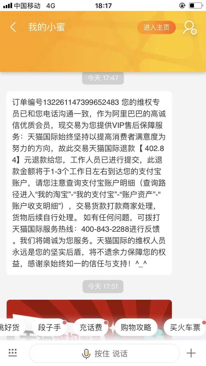 10.天猫转移了卖家保证金退给了我,因为这个事情扯了那么多天之后,那个电熨斗下落不明,打了天猫电话,打了快递电话,发现卖家把我退货的包裹收走了,却不给我退款,纳尼?然后又跑去天猫申诉,又打电话给天猫客服,又进行各种举证,废了很多口水之后,退款终于进了我的支付宝。但,事情还没有完…