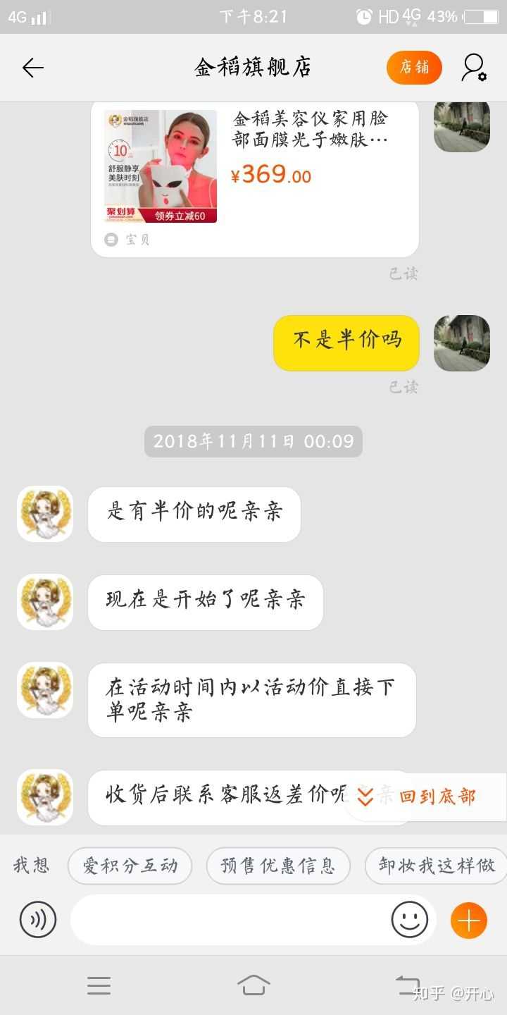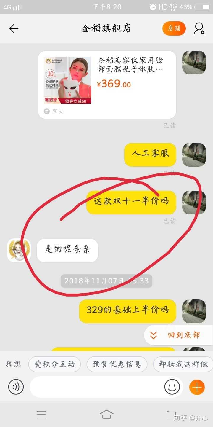 我是在天猫金稻旗舰店购买的光子嫩肤仪,双十一显示到手价329的半价,我在双十一之前以及双十一当天,都和客服进行了确认,有截图,这个也是以后维权的重要凭证。(幸亏我多嘴问了一句,不然现在就不能维权了,我也是第一次维权 )