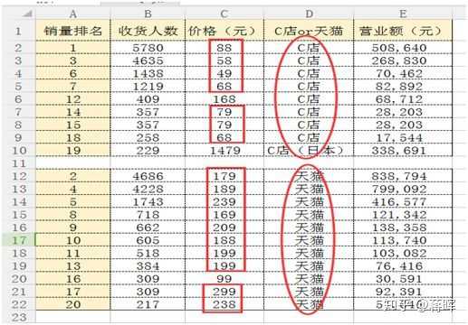 包括天猫、C店。最好制成表格,通过分析后,找到一个空白的价格段进入市场。这是我以前在做同行价格分析制作的表,可以看出49-88是c店在做,169-239是天猫在做,于是我们的产品,最终以88-239的天猫店开始去打开市场。