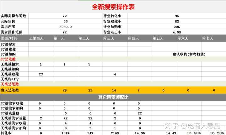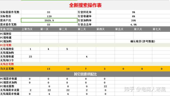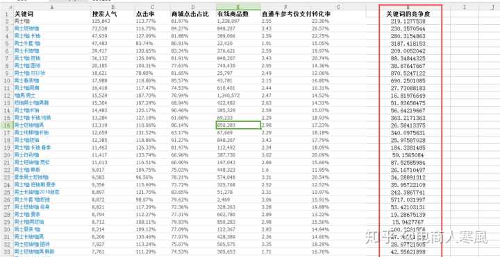 公式=搜索人气*支付转化率/在线商品数*10000 (为了好算数据后面我们乘10000)