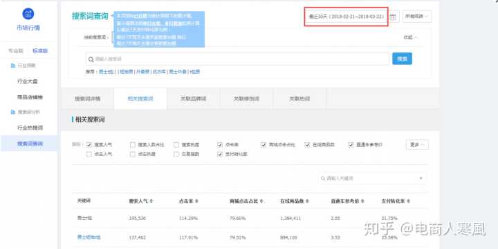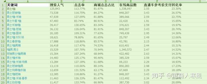 我选的这个词有足够多的搜索人气,时间我们选择最近30天,指标我们选择搜索人气、点击率、商城店及占比、在线商品数、直通车参考价、支付转化率这些指标,下面我们复制100个词的数据到excel表格里,这个数据不支持下载我们就只能复制一下了。