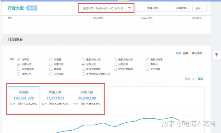 好下面我们要操作的是行业的收藏率加购率,转化率这个数据我们就不用去操作了,那么这个我们怎么计算呢?打开生意参谋-市场行情-行业大盘 选择最近30天,数据我们只选择访客数、加购人数、收藏人数,用收藏人数、加购人数分别去/访客数得到行业均值,我们只要保证这两个率不低于行业水平就够了,因为行业数据里有虚假的成分我们不用太过计较。
