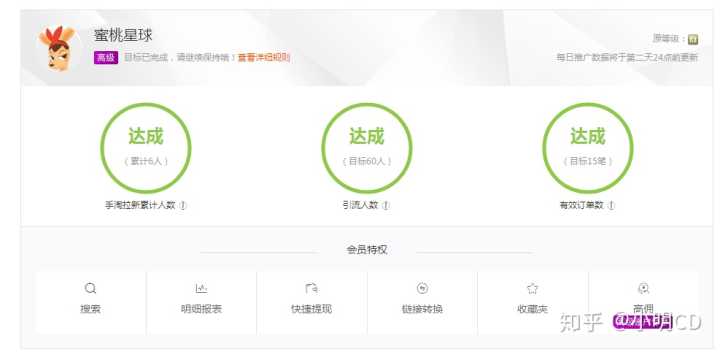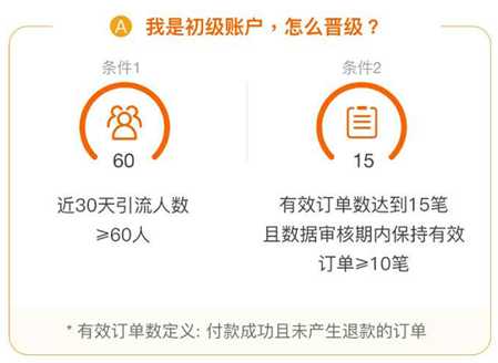 联盟升级:初级或中级推广者在近30天内完成相应等级目标后,次日更新数据,第三天升至高级账户(遇每月1号延至2号变更状态)