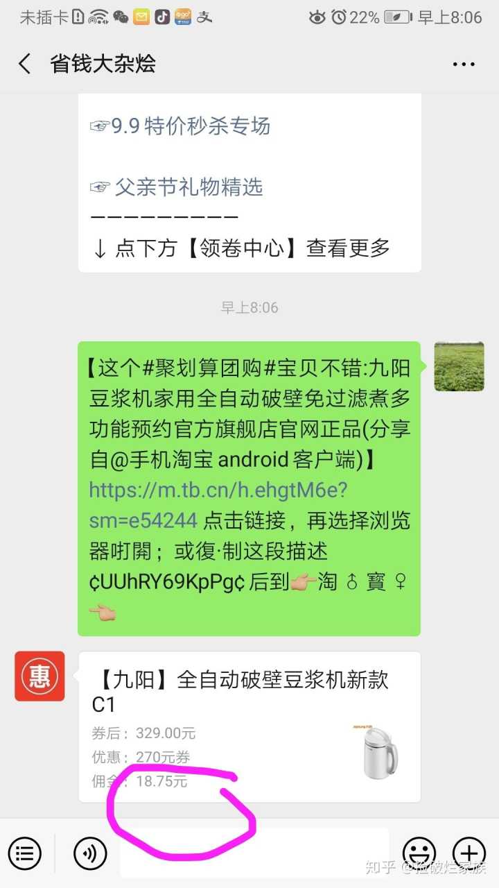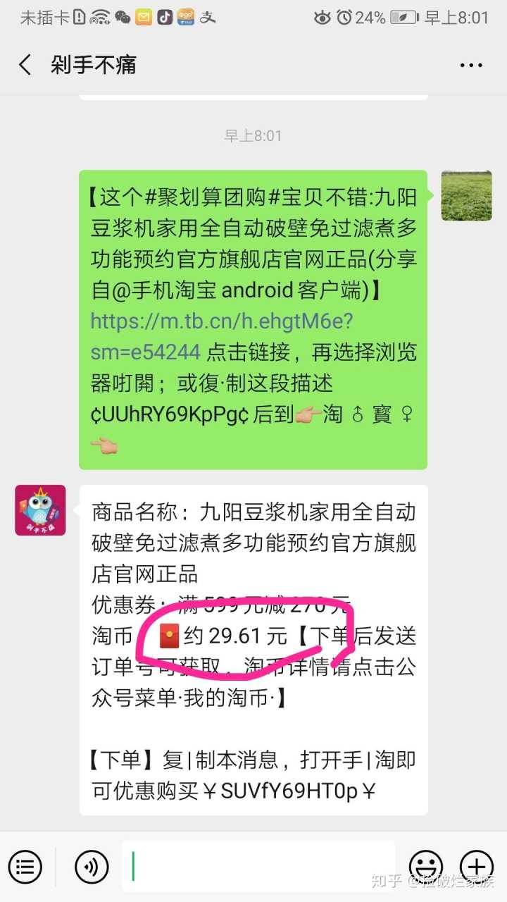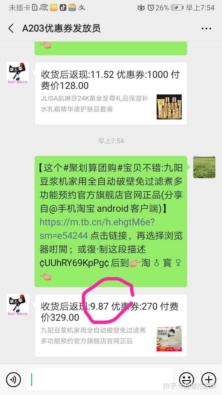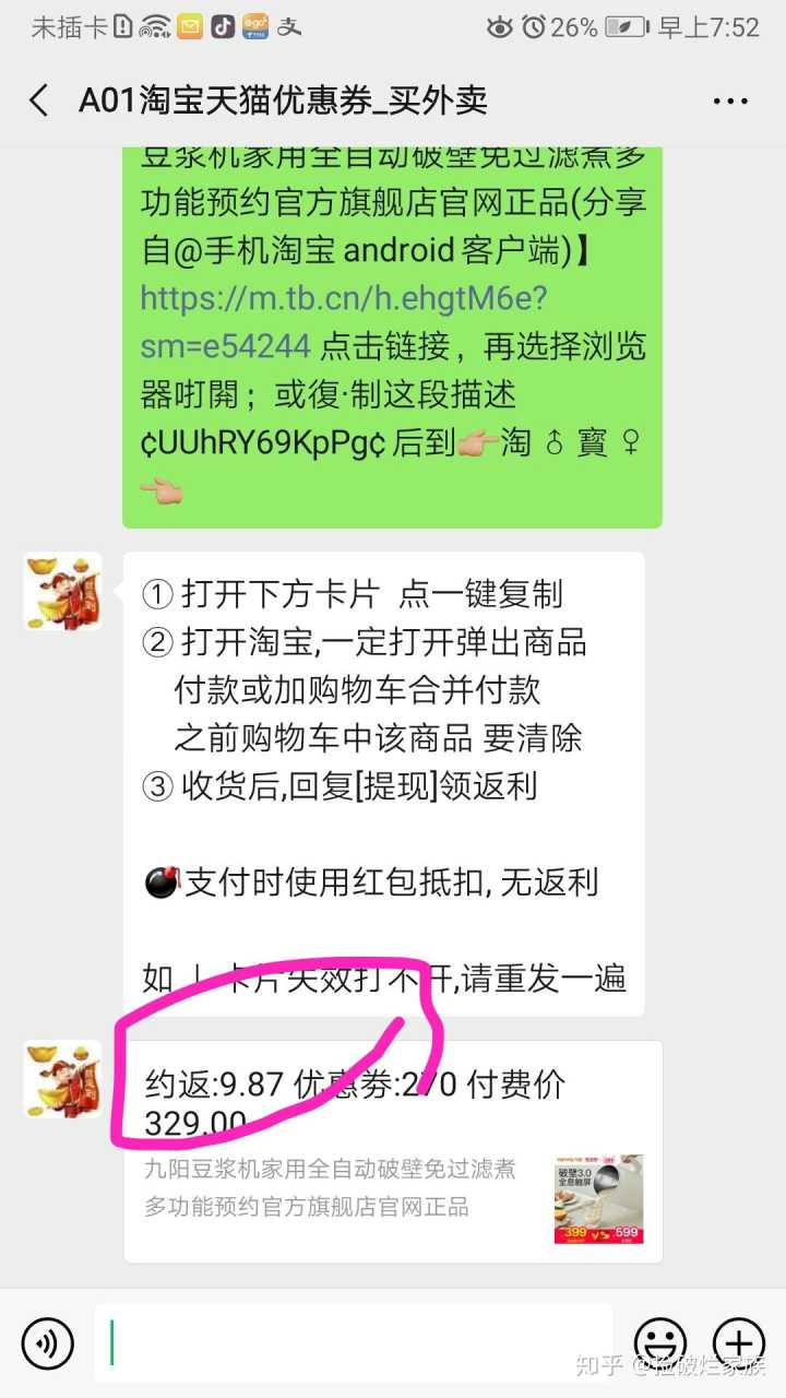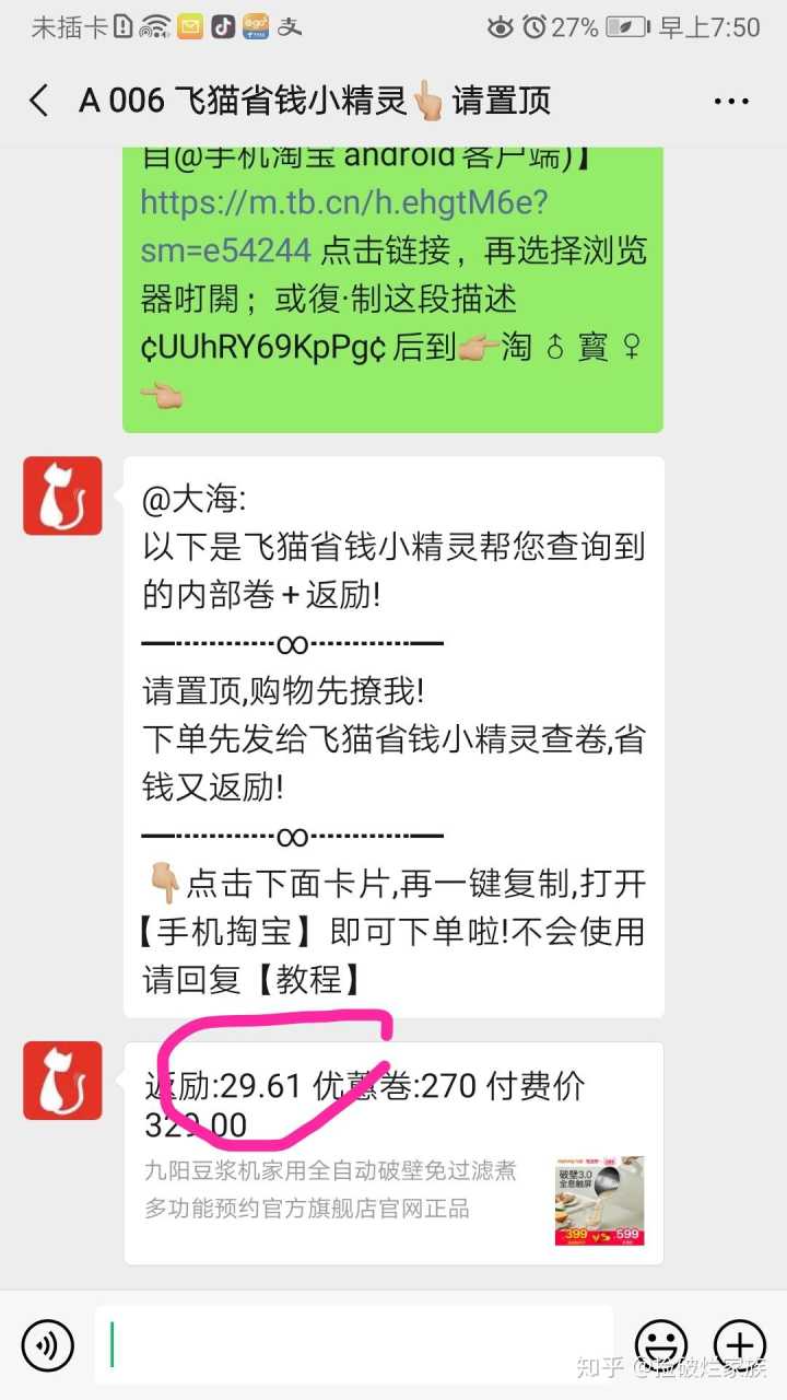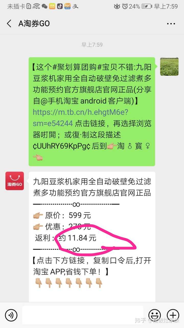 这个呢是我自己最近买东西,然后直接把链接发给这个“返利的机器人”,然后他就会自动弹出一个链接,我就直接把那个优惠券拿去用了。