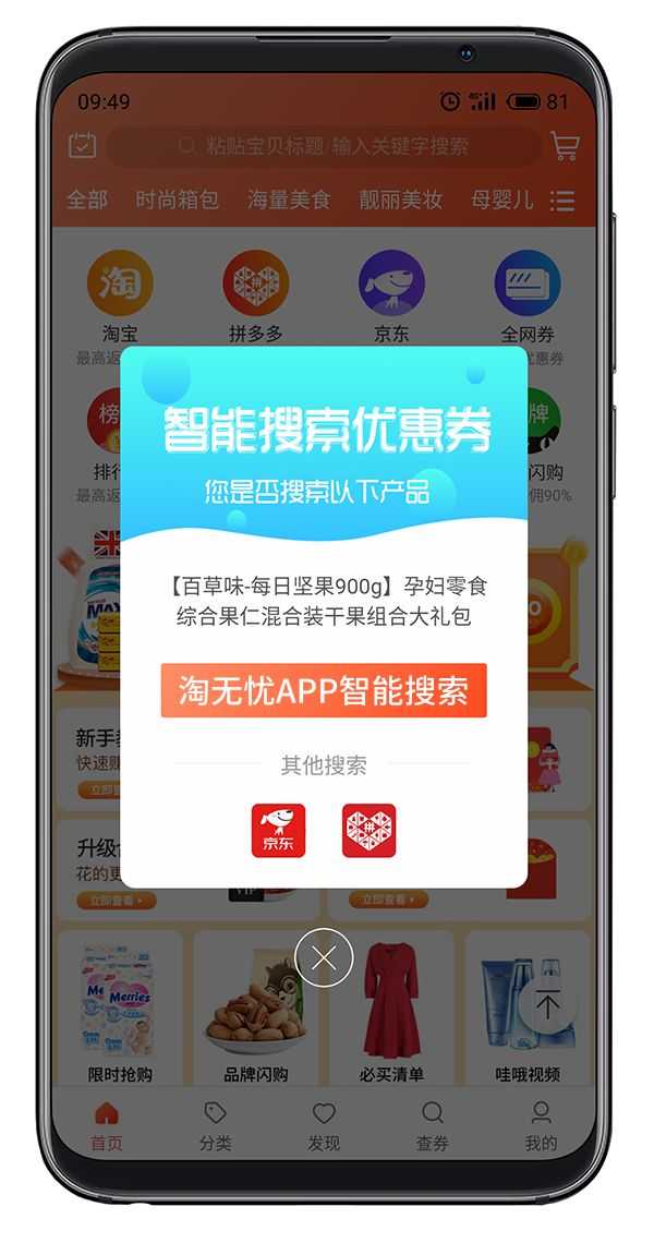 也可以在顶部搜索商品关键词,选好自己喜欢的商品,点击购买,自动跳转到淘宝下单,方便实用。功能强大。