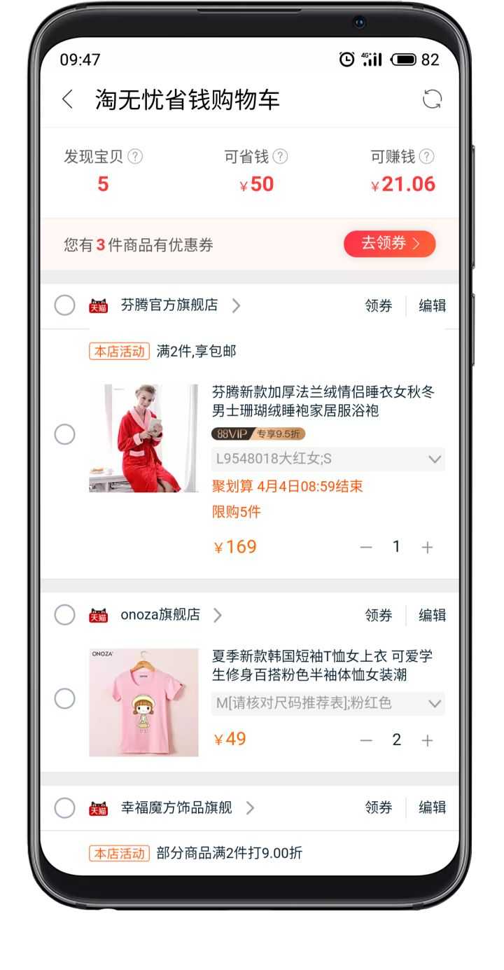 只要在淘宝把喜欢的商品添加到购物车,然后打开美逛APP,打开购物车查券,可以一目了然的知道优惠商品信息和返利金额。因为美逛实时同步你的淘宝购物车。不像微信查券那么繁琐,来回复制淘口令。