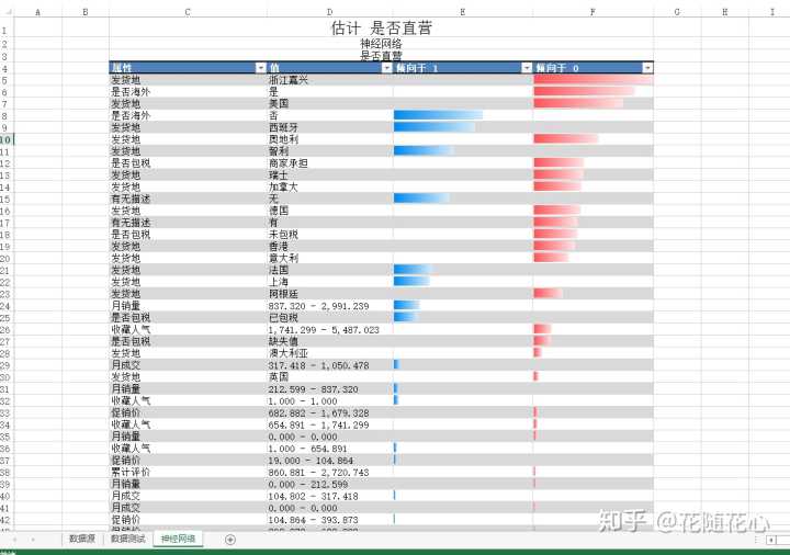 正如上面这个图所示,有两个字段,一个叫做倾向于1,一个叫做倾向于0。1代表直营,0代表非直营。 通过红蓝色块的占比分析,我们可以看出来,基本上有如下特征。 是否海外:否 有无描述:无 月销量:837.320 – 2,991.239 是否包税:已包税 也就是蓝色块占比最多的那些字段,当然由于这里只有596个新品,数据量有限,因此会出现很大的误差。如果数据量增加到上万条的话,估计预测结果会更准。